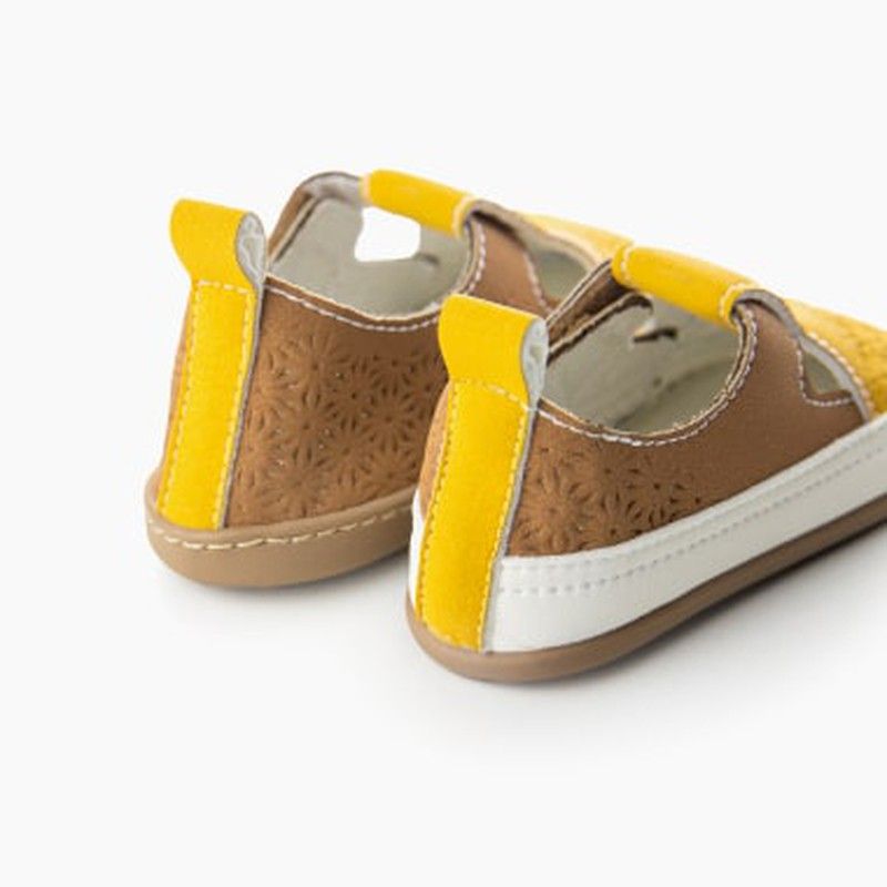 Senffarbenes Obermaterial mit Stanzverzierung und Lederabsatz mit Stanzverzierung. Toffeefarbene Sohle.