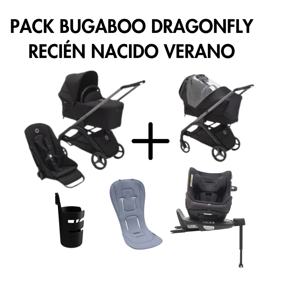 El pack incluye: Bugaboo Dragonfly incluido capazo Colchoneta integral de confort doble Bugaboo Portavasos Bugaboo Cubierta para la lluvia Silla de coche Bugaboo Owl Bugaboo Base 360 ISOFIX by Nuna